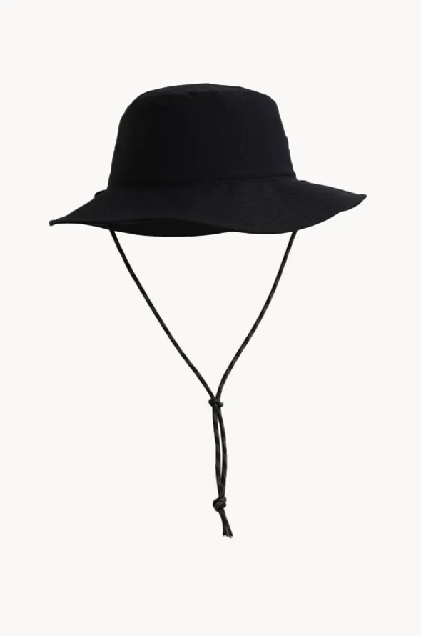 Quiksilver Mens Boat Master Hat in Black features a bucket style hat, floppy brim, chin strap with adjustable toggle, and is available in sizes S-XL.