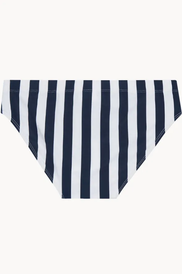 Vacay Mens Oslo Brief in Navy/White features an elasticated waistband, drawcord, embroidered logo, quick drying fabric, and is available in sizes S-XL.