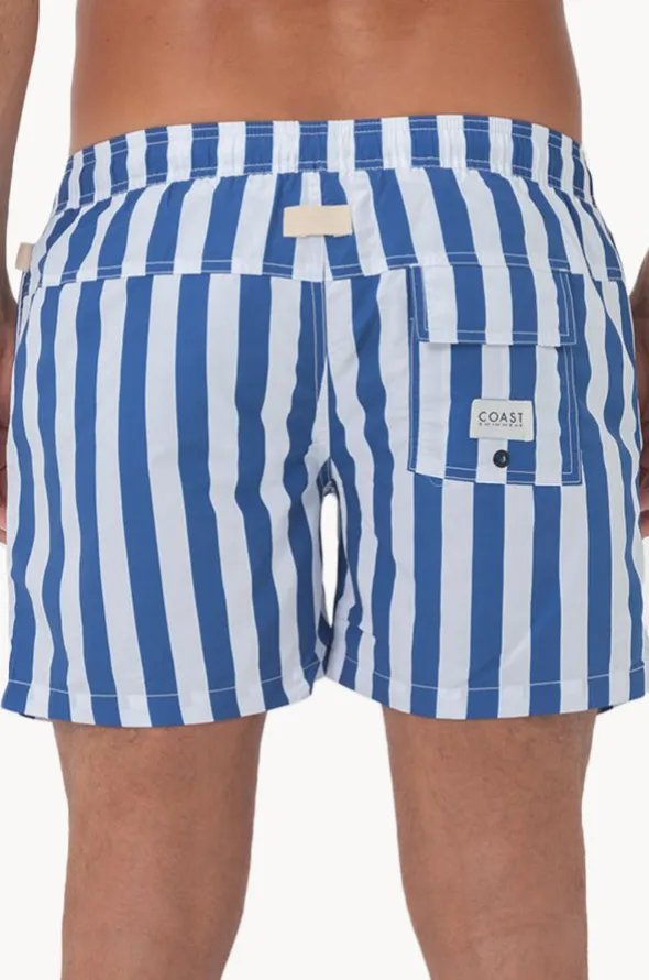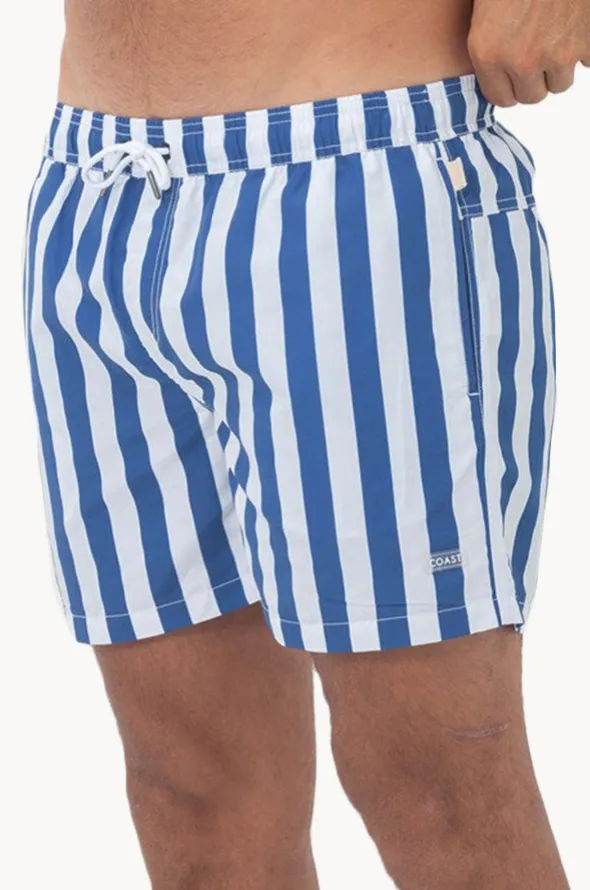 Coast Mens Santorini Swim Short in Blue features an elasticated waistband, drawcord, inner mesh brief, side pockets, back pocket, is available in sizes S-3XL.