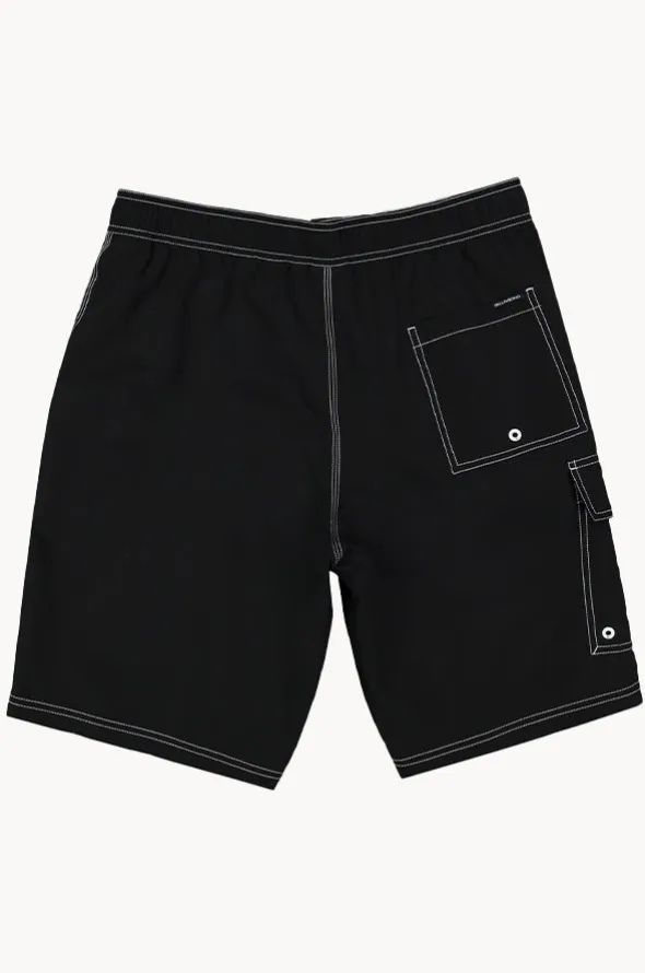 Billabong Mens Throw On Boardshort in Black features contrast stitching, elasticated waistband, drawcord, side patch pocket, and is available in sizes S-2XL.