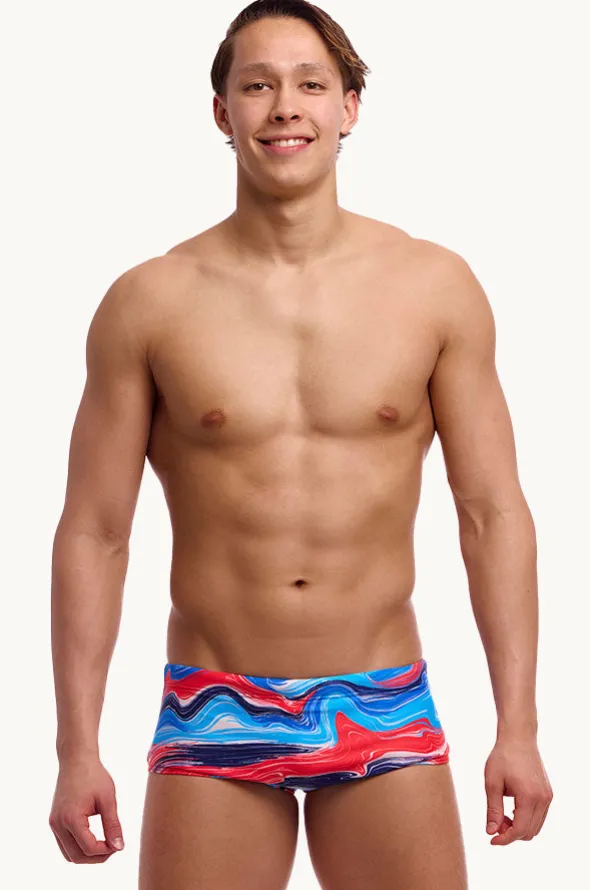 Funky Trunks Mens Wave Craze Trunk in Blue/Red features 16.5cm sides, full front lining, elastic waistband and leg openings, and is chlorine resistant.