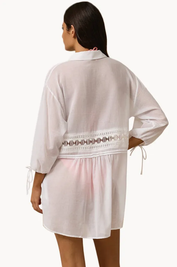 Monte & Lou M&L Newport Shirt in White offers a relaxed fit, long sleeves with adjustable tie, pintuck detail with trim inserts, and is available in sizes XS-L.