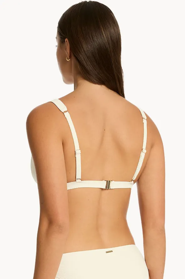 Sea Level Nautique Chain Link Longline Tri in Coconut features a V-shaped neckline with chain link detail, removable cups, and is best suited to B-D cup sizes.