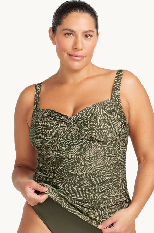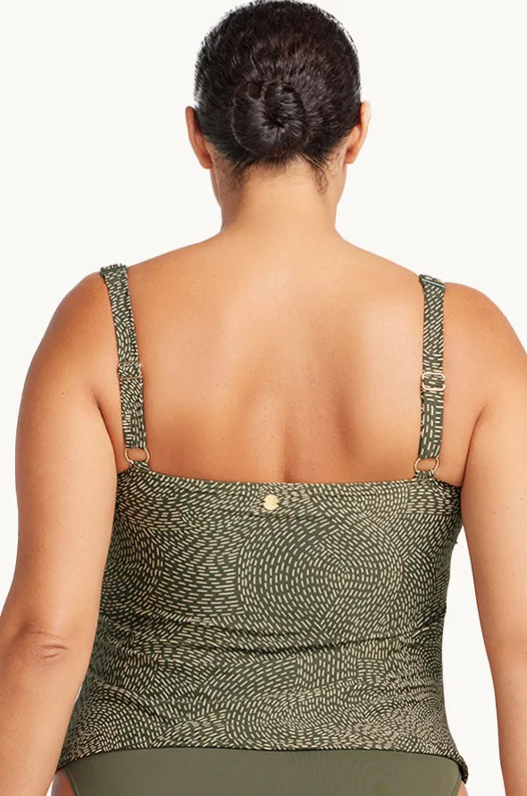 Artesands Onda Perspective Botticelli Tankini Separate in Olive features soft cups, adjustable straps, shelf bra, and is best suited to C-DD cup sizes.