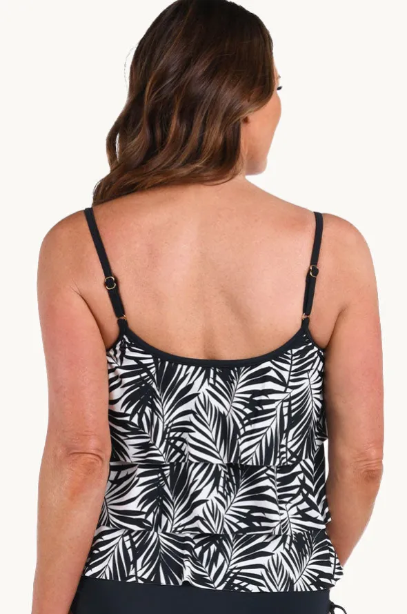 Maxine Palm Retreat Tiered Tankini Separate in Black/Ivory features adjustable straps, loose tiered design, moulded cups, and is best suited to A-C cup sizes.