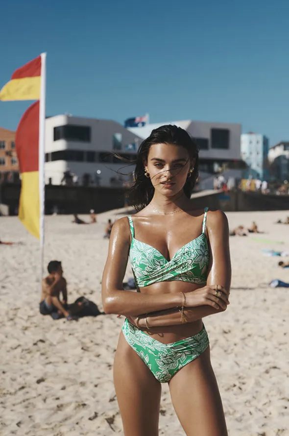 Sea Level Palmera D/DD Cup Cross Front Bra in Green features underwire, optional booster pads, moulded cups, powermesh, and is best suited to D-DD cup sizes.