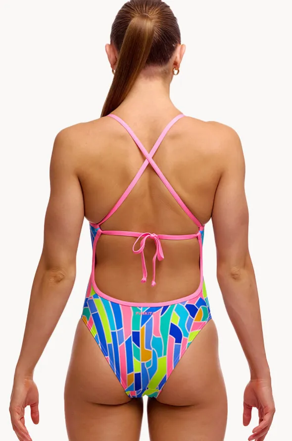 Funkita Pillared Tie Me Tight One Piece in Multi offers cross back straps with tie, cheeky coverage, chlorine resistant, best suited to A-C cup sizes.