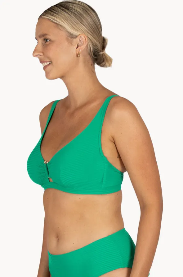 Baku Positano D/E Cup Underwire Bra in Emerald features a U-bar front detail, underwire, removable cups, side boning, and is best suited to D-E cup sizes.
