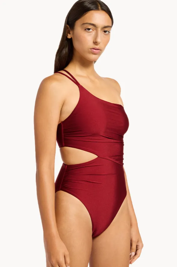 Jets Sol Shine One Shoulder One Piece in Ruby features an asymmetrical neckline, two straps, removable cups, shelf bra, and is best suited to A-C cup sizes.