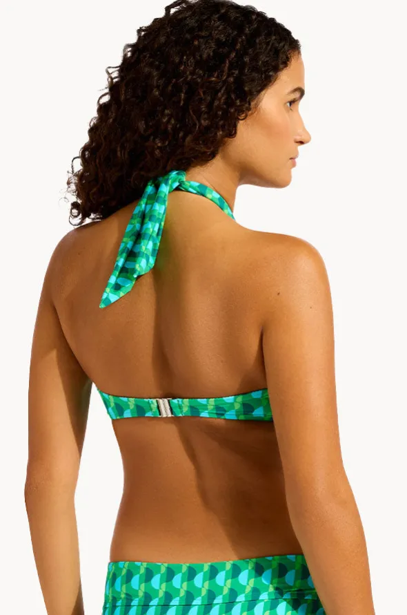 Seafolly Sorrento Halter Bandeau in Vivid Green features gripper tape, adjustable halter tie, soft cups, side boning, and is best suited to A-C cup sizes.