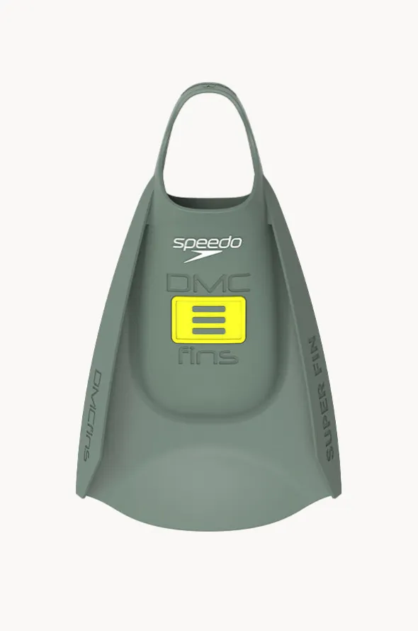 Speedo X DMC Super Fin in Olive features a unisex training fin, reverse V rail technology, universal foot cavity, and is available in sizes XS-XL.