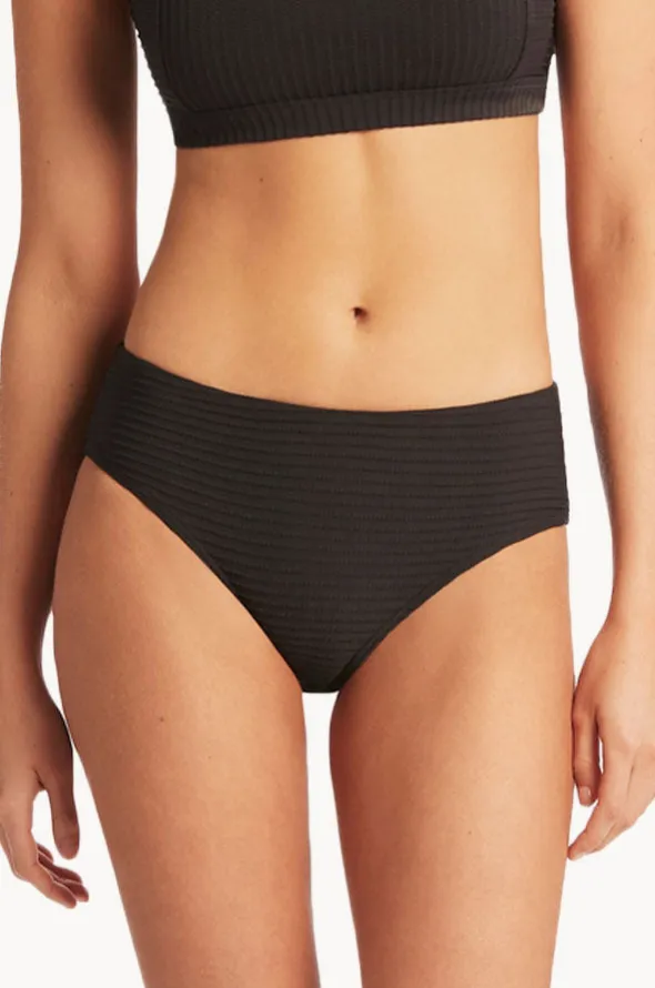 Sea Level Spinnaker Mid Bikini Pant in Black features a mid rise fit, powermesh, regular legline, medium coverage, and is made from textured fabric.