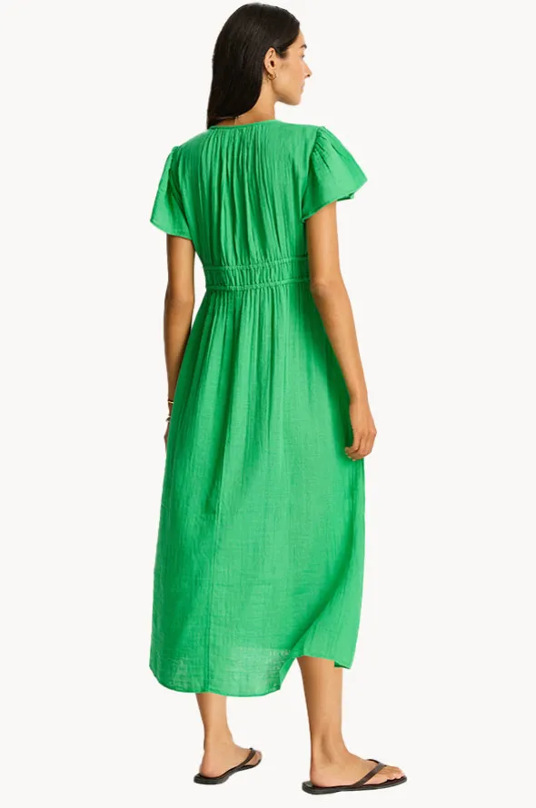 Sea Level Sunset Maxi Daydress in Kelly Green features short sleeves, elastic underbust band, relaxed fit, maxi length, and is available in sizes XS-XL.