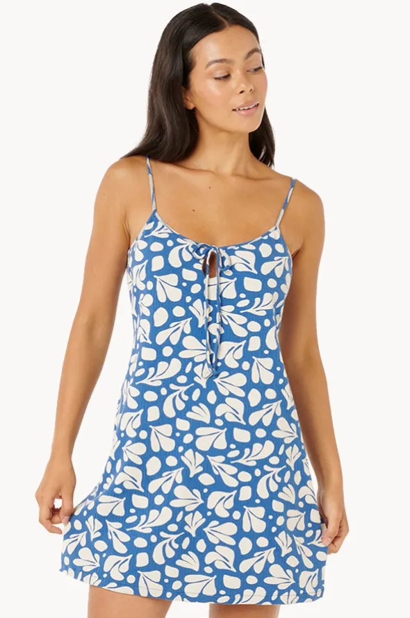 Rip Curl Surf Dreams Printed Rib Mini Dress in Blue features adjustable straps, front tie, short length, straight fit, and is available in sizes XS-XL.