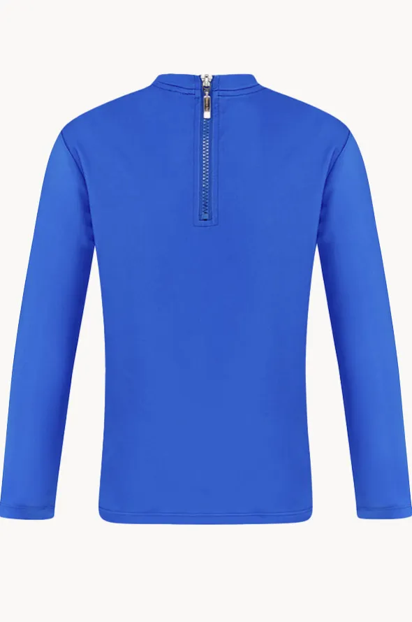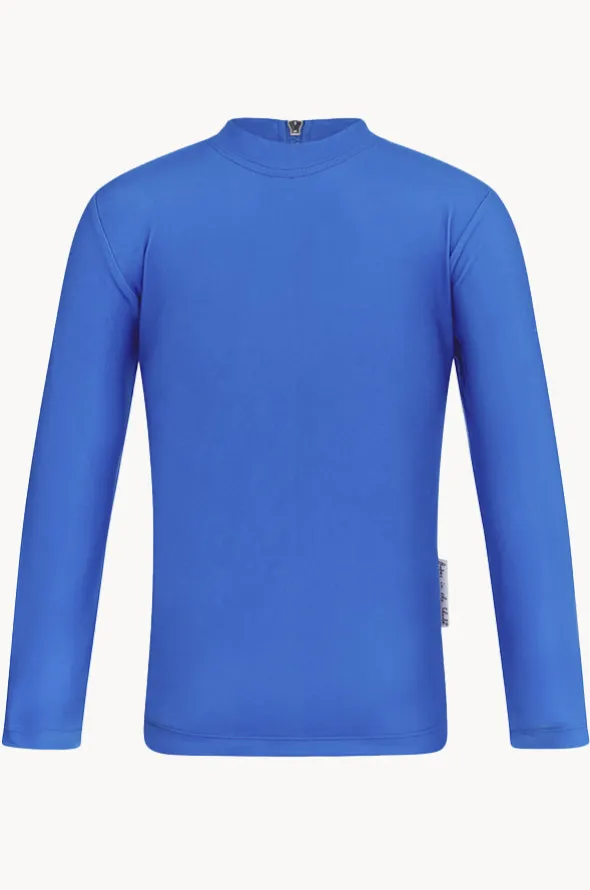 Babes In The Shade Boys Suntop in Sky features a round neckline, sun protection, long sleeves, back zip, chlorine resistant, and is available in sizes 8-14.
