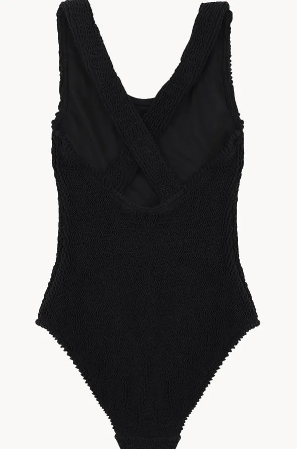Minihaha Teen Girls Coco One Piece in Black features a scoop neckline, cross back shoulder straps, fully lined, sun protection, and is available in sizes 8-16.