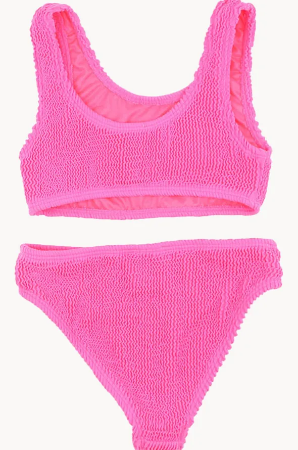 Minihaha Teen Girls Koa Crop Set in Fluro Pink features a round neckline, stretch crinkle fabric, hipster pant, fully lined, and is available in sizes 7-14.