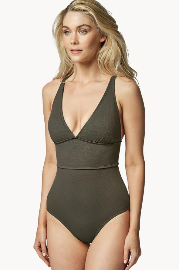Une Piece Textured Classic One Piece in Khaki features a V-shaped neckline, removable cups, adjustable and convertible straps, is best suited to B-D cup sizes.