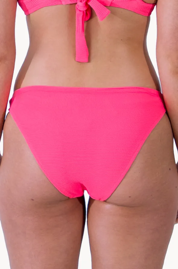 The Base Swim Textured Hipster High Leg Pant in Bright Coral features a raised legline, hipster fit, and textured fabric, designed in sizes 6-16.