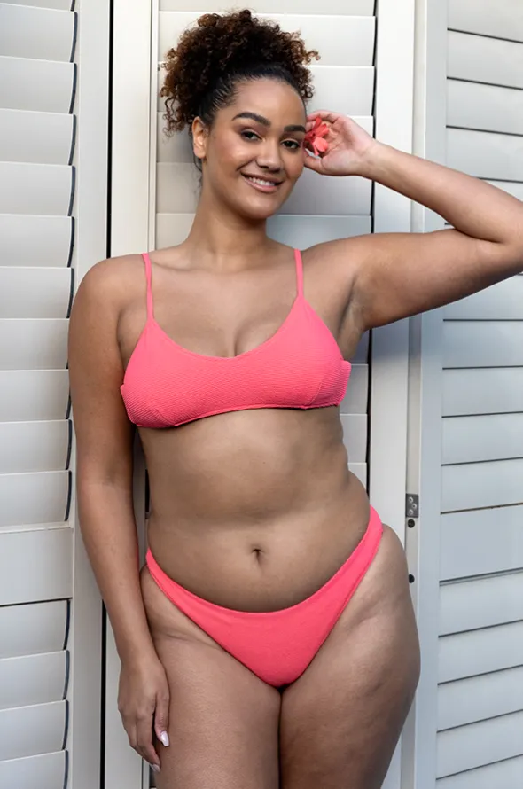 The Base Swim Textured Tie Back Bralette in Bright Coral features removable soft cups, convertible straps, textured fabric, and designed for A-D cup sizes.