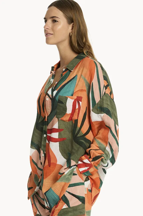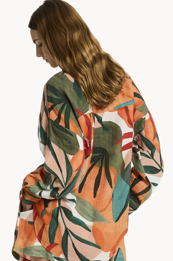 Sea Level Tropaluxe Beach Shirt in Khaki features a collared neckline, button through, long sleeves with structured cuffs, and is available in sizes XS-L.