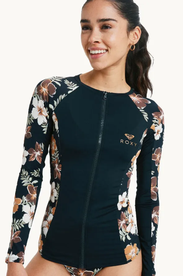 Roxy Tropical Feels Long Sleeve Suntop in Black/Multi offers a round neckline, front zip, long sleeves, UPF 50+ sun protection, and is available in sizes S-XL.