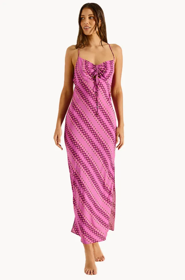 Tigerlily Utopia Goldie Maxi Dress in Orchid features a front drawstring, side splits, slim fit, open back with adjustable tie, and is available in sizes 8-14.