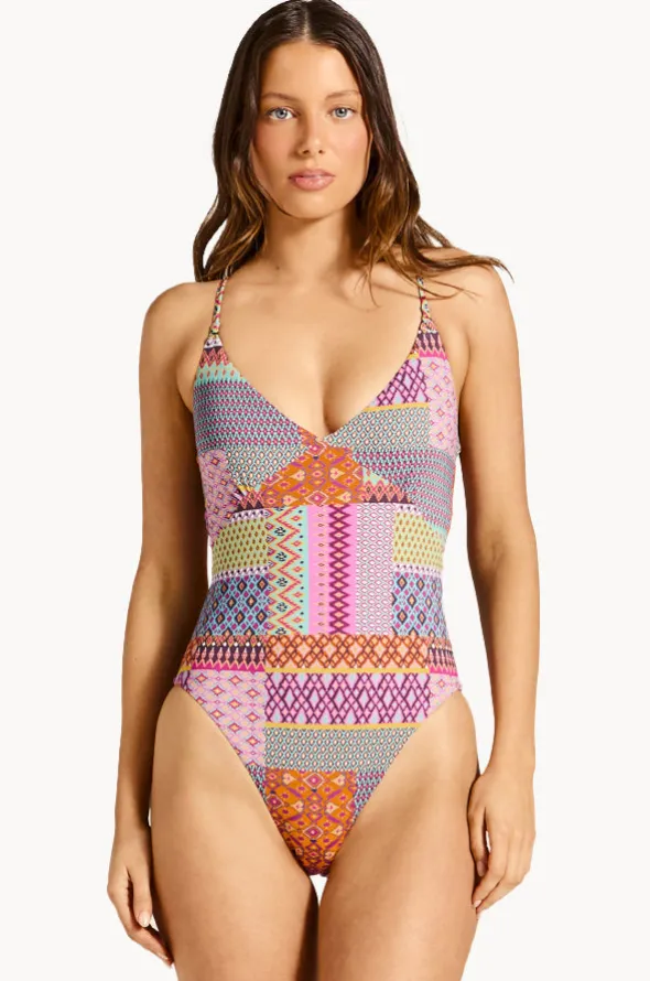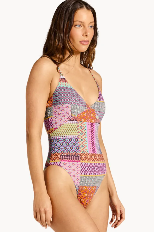 Tigerlily Utopia Hot Elle One Piece in Multi offers a gathers at bust, adjustable straps with tie back, cross back straps, is best suited to A-C cup sizes.