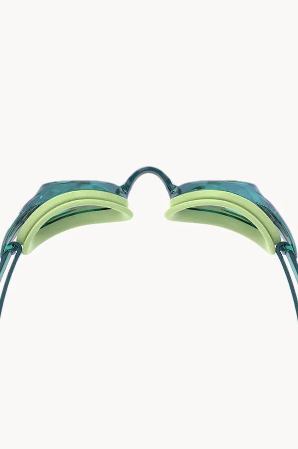 Speedo Vanquisher 3.0 Mirrored Goggle in Teal offers a soft eye gasket, UV protection, mirrored lenses, adjustable strap, and is available in O/S.