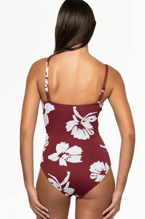 Nip Tuck Whispering Allure Louise One Piece in Maroon features a cross front neckline, adjustable straps, powermesh, and is best suited to C-DD cup sizes.