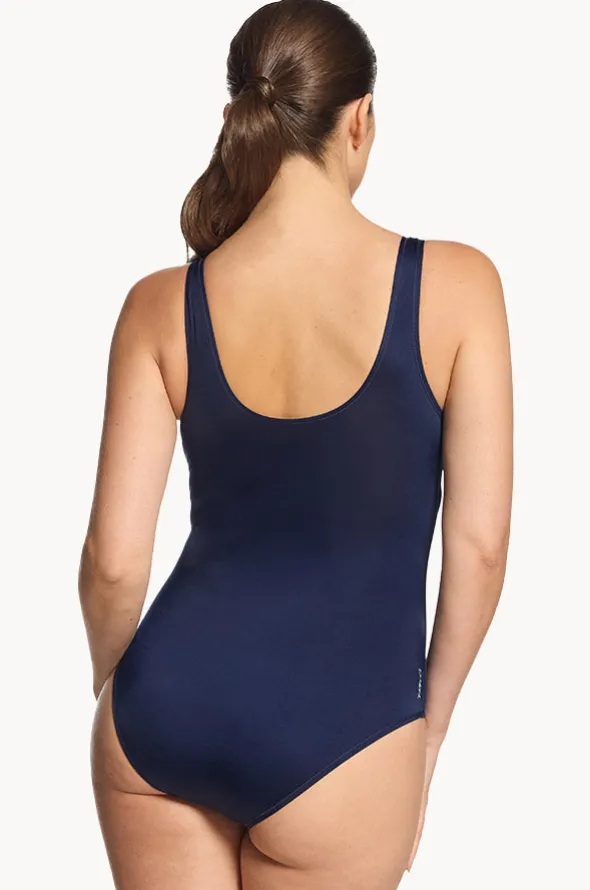 Zoggs Zephyr Scoopback One Piece in Navy/Pink features a scoop neckline, fixed straps, shelf bra, sustainable thread, and is best suited to B-E cup sizes.
